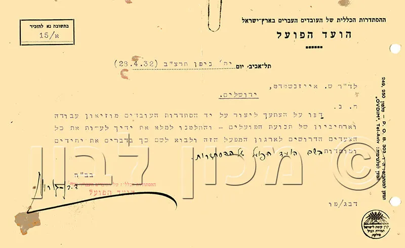 בן גוריון קיבל באהדה רבה את רעיון הקמת מוזיאון לתנועת העבודה ואישר את הקמתו. בעקבות פנייתו החליט הוועד הפועל של הסתדרות העובדים להקים גוף מרכזי אשר יופקד על שימור המורשת ההיסטורית של ההסתדרות ושל תנועת העבודה היהודית בארץ ובעולם. על החלטה זו בישר בן-גוריון לפרופ' אייזנשטדט במכתב שנשלח ביום י"ח בניסן, תרצ"ב (28 באפריל 1932). כמו כן, נקבע כי שמו של הגוף יהיה "הארכיון והמוזיאון של תנועת העבודה" , פרופ' אייזנשטדט מונה למנהלו.